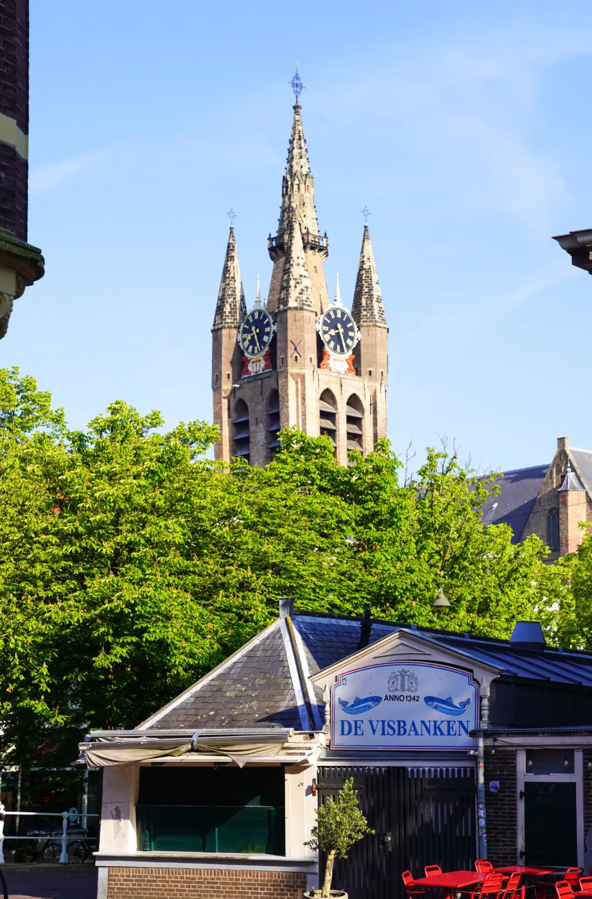 Vanaf het begin stond de Oude Kerk direct aan de ‘Delf', het oude woord voor ‘gracht', waaraan Delft haar naam dankt. Toen ze in 1325 een toren aan de kerk wilden bouwen, was daarvoor dus geen plek. Daarom werd waarschijnlijk het water omgelegd en de gracht gedempt. De gracht heet inmiddels Oude Delft, maar de omlegging is nog steeds zichtbaar op de plattegrond.