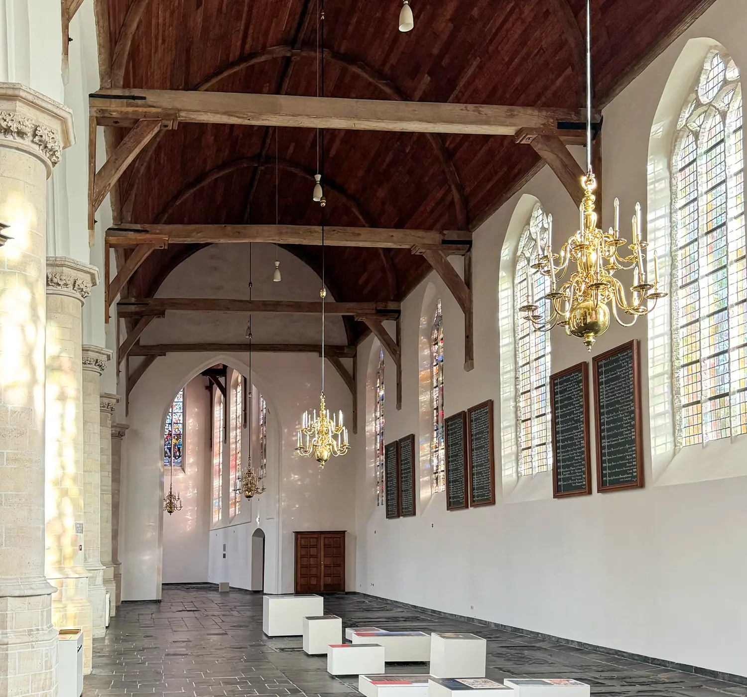 Naast de kleurrijke ramen, indrukwekkende marmeren praalgraven en mooie orgels, bevat het interieur van de Oude Kerk ook een serie van zeven grote naamborden.