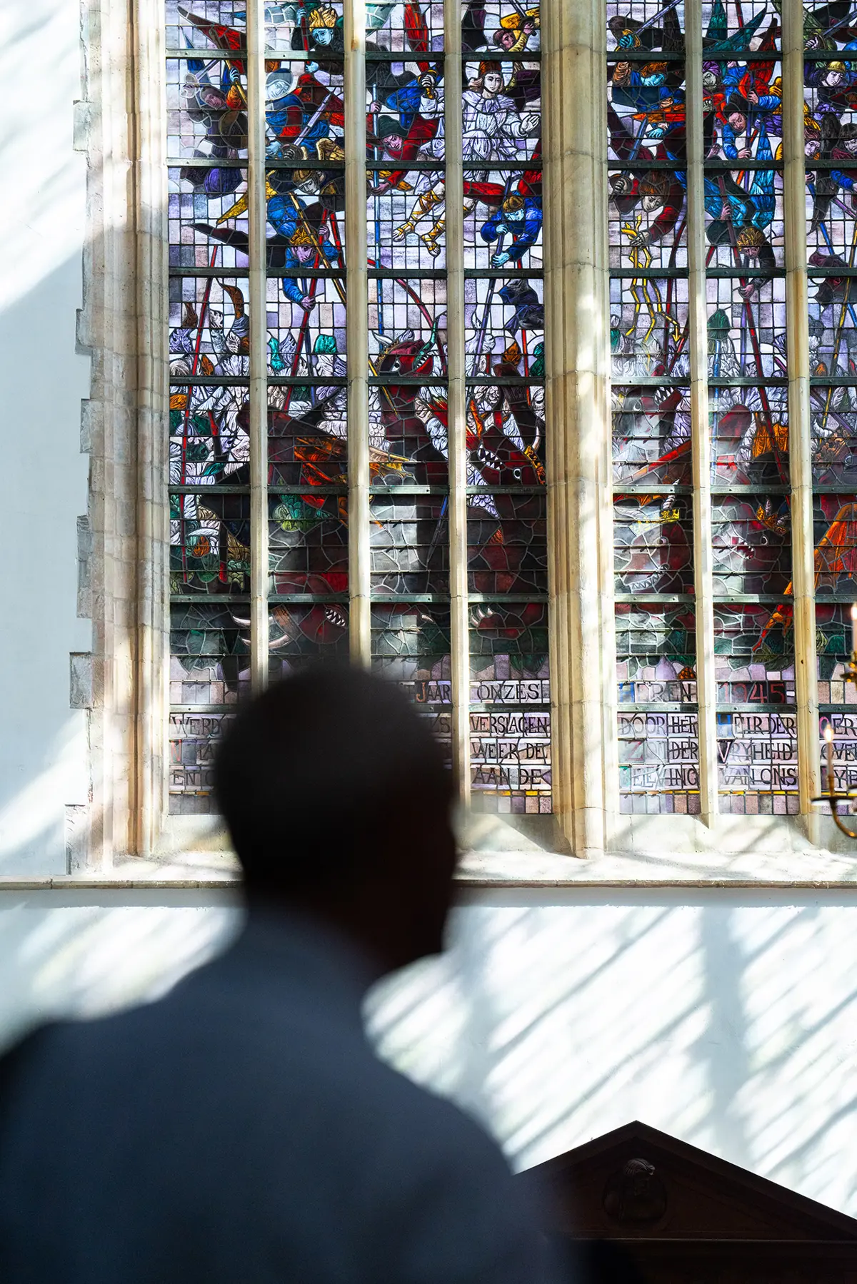 Een serie prachtige gebrandschilderde glas-in-loodramen maakt de markante uitstraling van de Oude Kerk compleet. Wanneer de zon door deze 'verhalen van glas' naar binnen schijnt, ontstaat er een indrukwekkend schouwspel van licht, lijnen en kleuren.