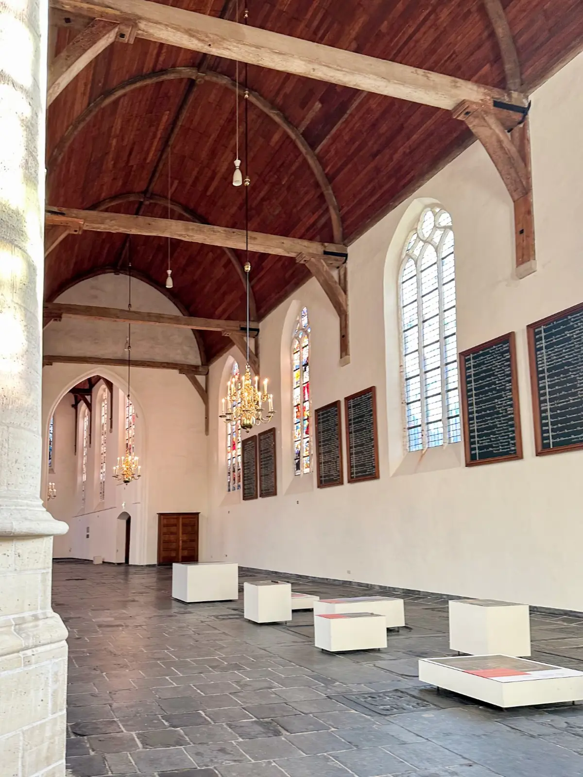 Naast de kleurrijke ramen, indrukwekkende marmeren praalgraven en mooie orgels, bevat het interieur van de Oude Kerk ook een serie van zeven grote naamborden.