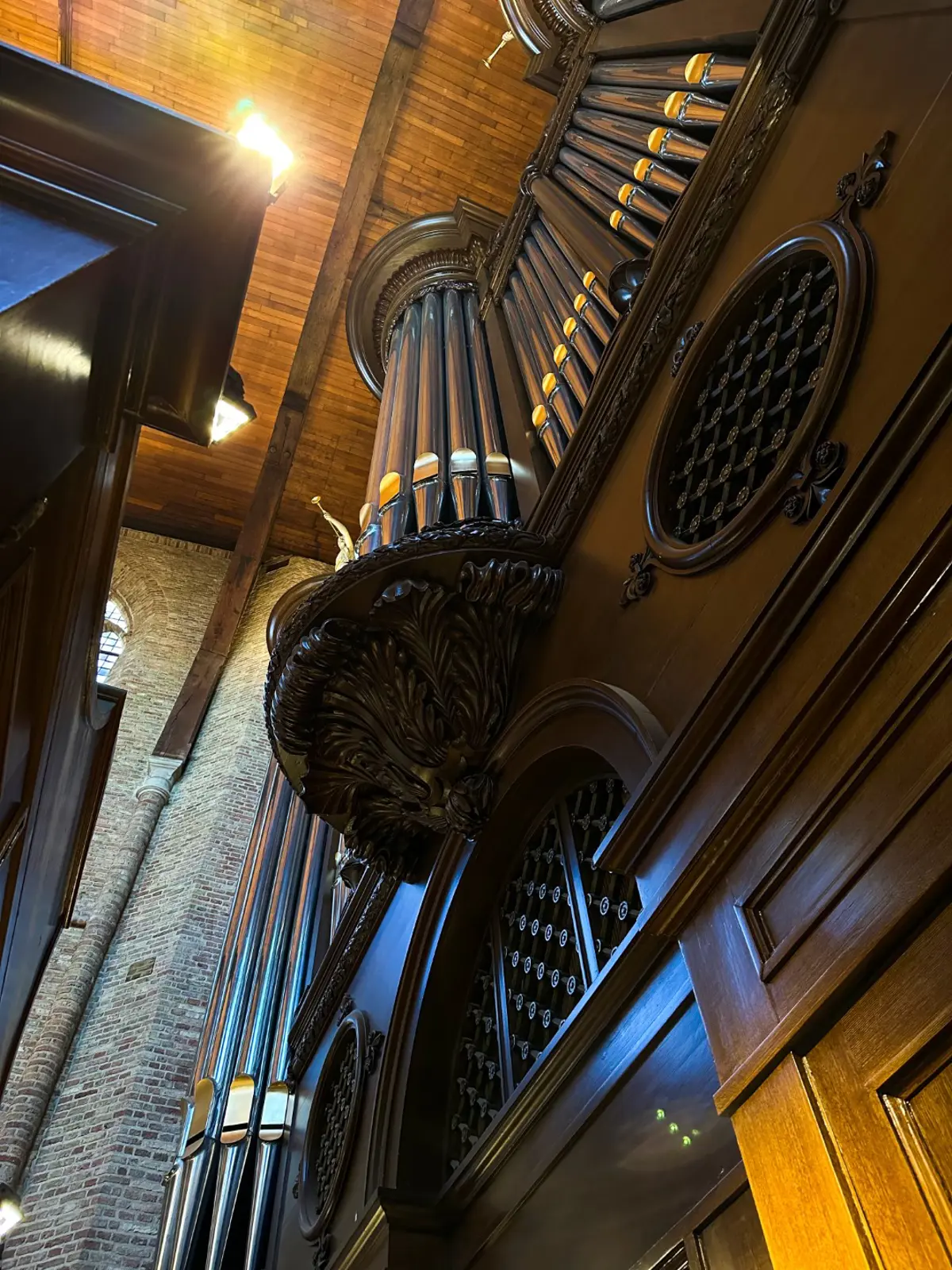 In de Nieuwe Kerk is zoveel te zien; iedere plek biedt je weer een ander perspectief op de architectuur en bezienswaardigheden. Kijkend vanaf het praalgraf van Willem van Oranje richting de ingang, wordt het uitzicht echter gedomineerd door slechts een object: het reusachtige pijporgel!