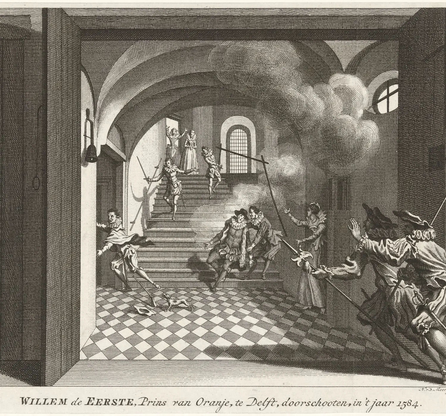 Op 10 juli 1584 maakte de katholieke Fransman Balthasar Gerards met pistoolschoten een einde aan het leven van Willem van Oranje. Hij had zich rond het middaguur aangediend bij de Prinsenhof in Delft, met de mededeling dat hij Willem wilde spreken. Nadat de prins zijn middagmaaltijd had gegeten en met zijn tafelgenoten de eetzaal verliet, was het moment daar. Gerards schoot hem van dichtbij in zijn borst en zij. De kogelgaten zijn nog altijd in de muren van het huidige Museum Prinsenhof te zien. Willem zakte in elkaar en overleed ter plaatse.