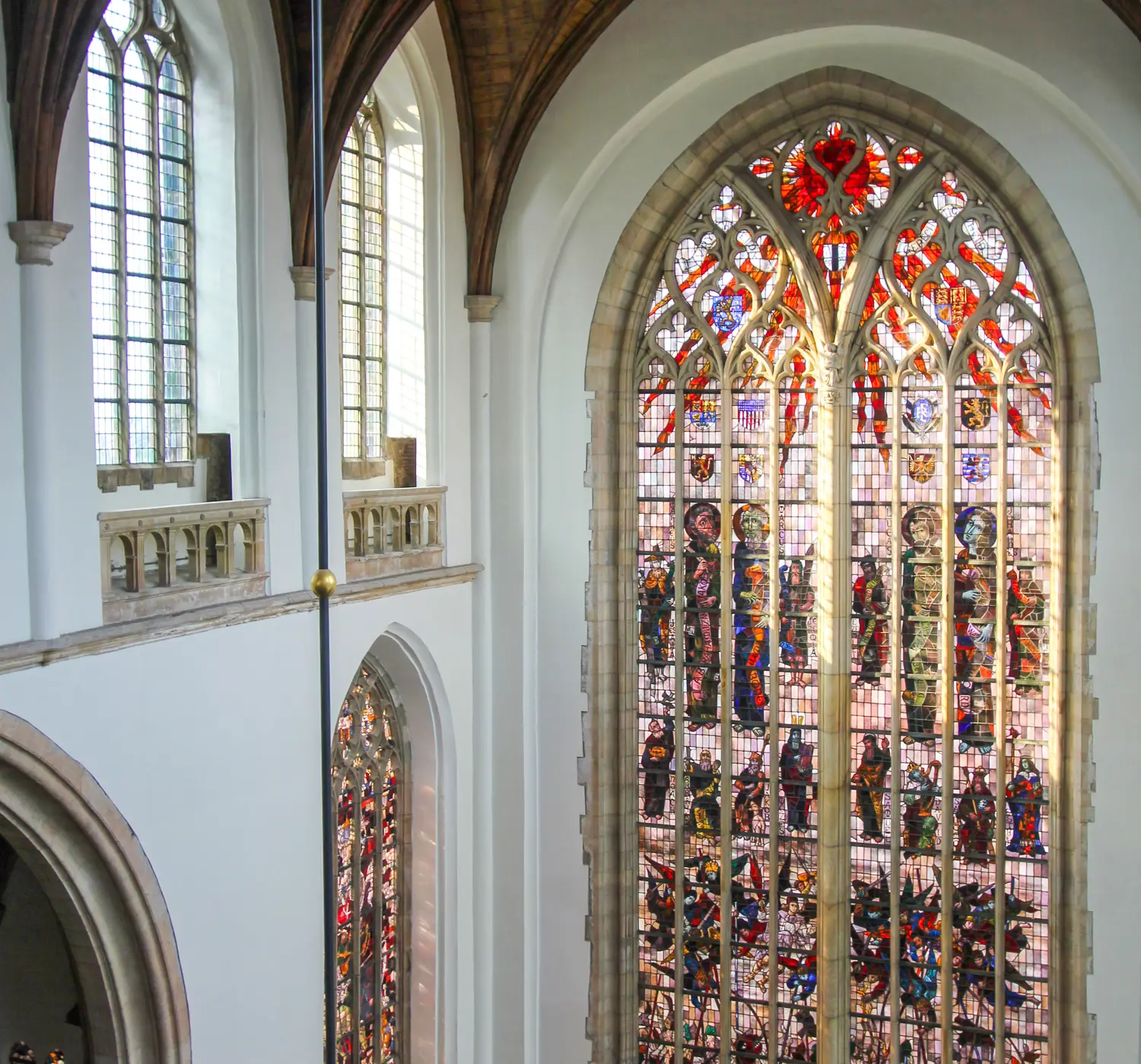 Op Bevrijdingsdag valt het licht in de Oude Kerk op een bijzonder venster: het Bevrijdingsraam in de kopgevel van de noorderkruisbeuk. Zodra de zon door het negentiende-meter-hoge glas speelt, kleuren de gewelven rood, oranje en goud. Een herinnering aan de bevrijding van 1945.