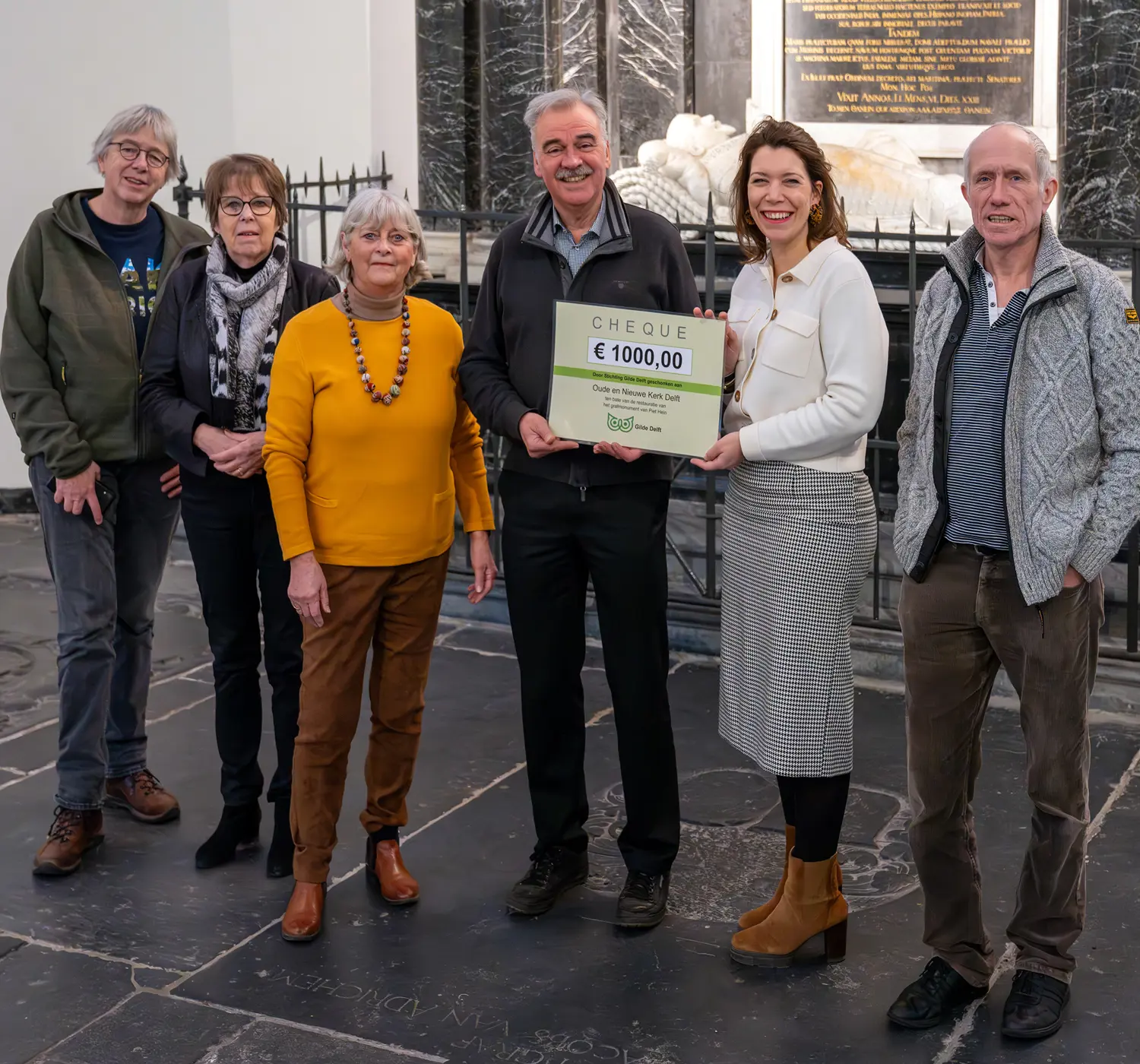 Gisteren was het Gilde Delft op bezoek in de Oude Kerk. De gidsen van het Gilde zijn regelmatige bezoekers in de kerken, zij vertellen tijdens hun stadswandelingen de mooiste verhalen over Delft. De reden voor het bezoek vandaag was een gulle gift van €1000,- voor de restauratie van het grafmonument van Piet Hein die de directeur van de Oude en Nieuwe kerk Delft, Nyncke Graafland, in ontvangst nam.