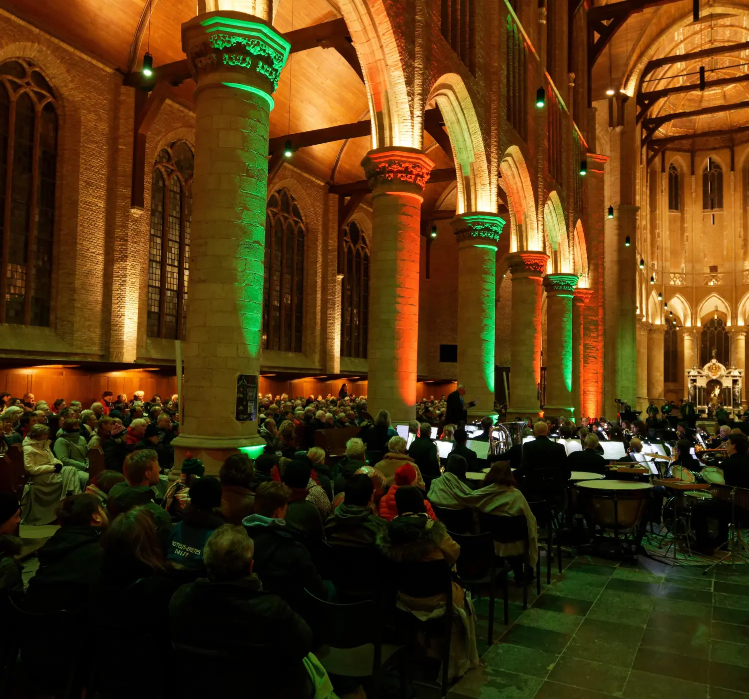 In de statige Nieuwe Kerk spelen de muzikanten feestelijke melodieën en swingende kersthits. Daarnaast staat ook een kerstsamenzang met traditionele kerstliedjes op het programma met een hoofdrol voor het publiek onder begeleiding van de bekende Delftse organist Christo Lelie.
