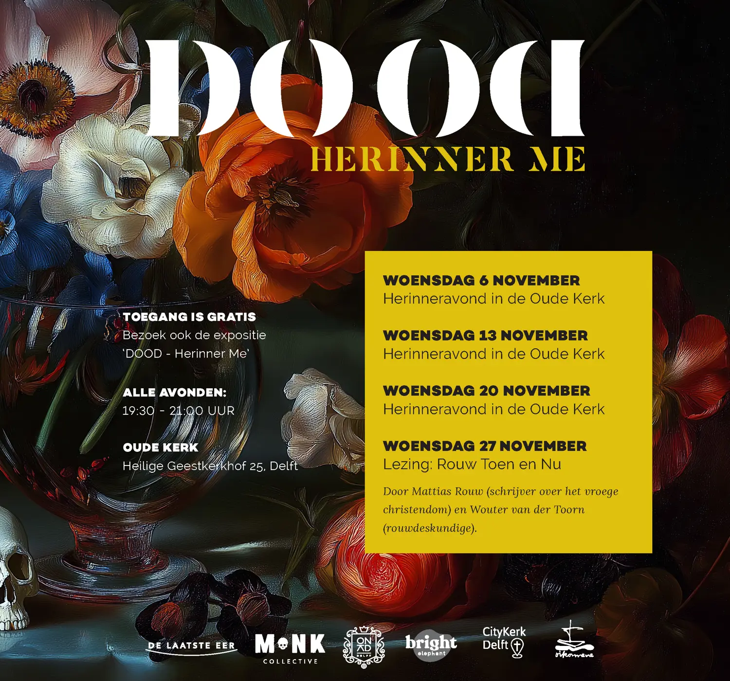 In de Oude Kerk is een bijzondere expositie over leven, dood en herinnering. ‘DOOD-Herinner Me’ nodigt bezoekers uit stil te staan bij het verlies en herdenken van dierbaren, door de eeuwen heen en nu. De Raad van Kerken Delft verzorgt een thema-avond op 27 november.