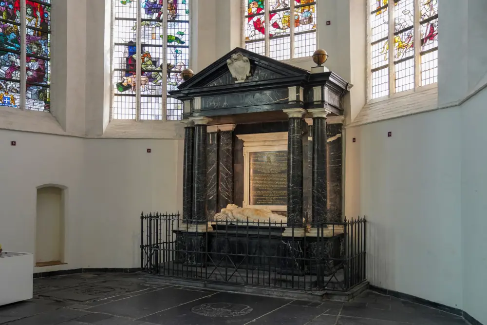 De Nederlandse luitenant-admiraal die tijdens de Tachtigjarige Oorlog een zeer kostbare Spaanse zilvervloot wist te onderscheppen, werd onder grote belangstelling begraven in de Oude Kerk. Staand voor zijn knap uitgevoerde grafmonument zie je dat het gedetailleerde witmarmeren matras met daarop de in het harnas gestorven zeeheld uit één stuk is gehouwen. De overige - overwegend zwarte - elementen dragen bij aan de markante uitstraling. De vermanende tekst op de achtergrond, laat jou niet zomaar los...